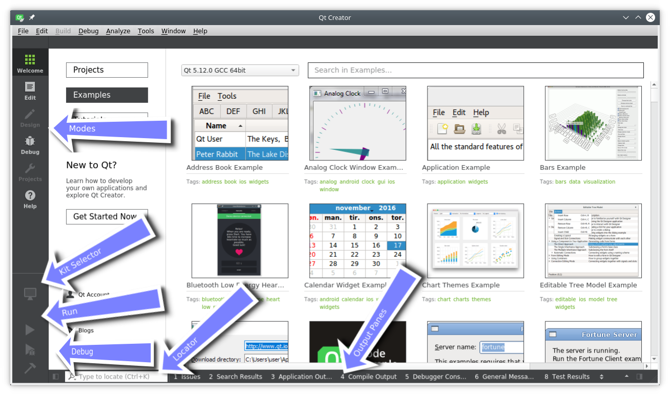 When starting Qt Creator you are greeted by the Welcome screen. There you will find the most important hints on how to continue inside Qt Creator and your recently used projects. You will also see the sessions list, which might be empty for you. A session is a collection of projects and configurations stored for fast access. This comes really handy when you have several customers with larger projects.